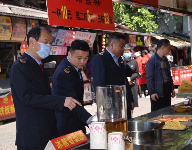 4月29日,岳阳市市场监管局会同岳阳楼区市场监管局联合派出执法人员,在岳阳楼汴河街、岳阳火车站等游客密集区域开展“五·一”节前餐饮安全督查,岳阳市市场监管局副局长李岳玲带队。