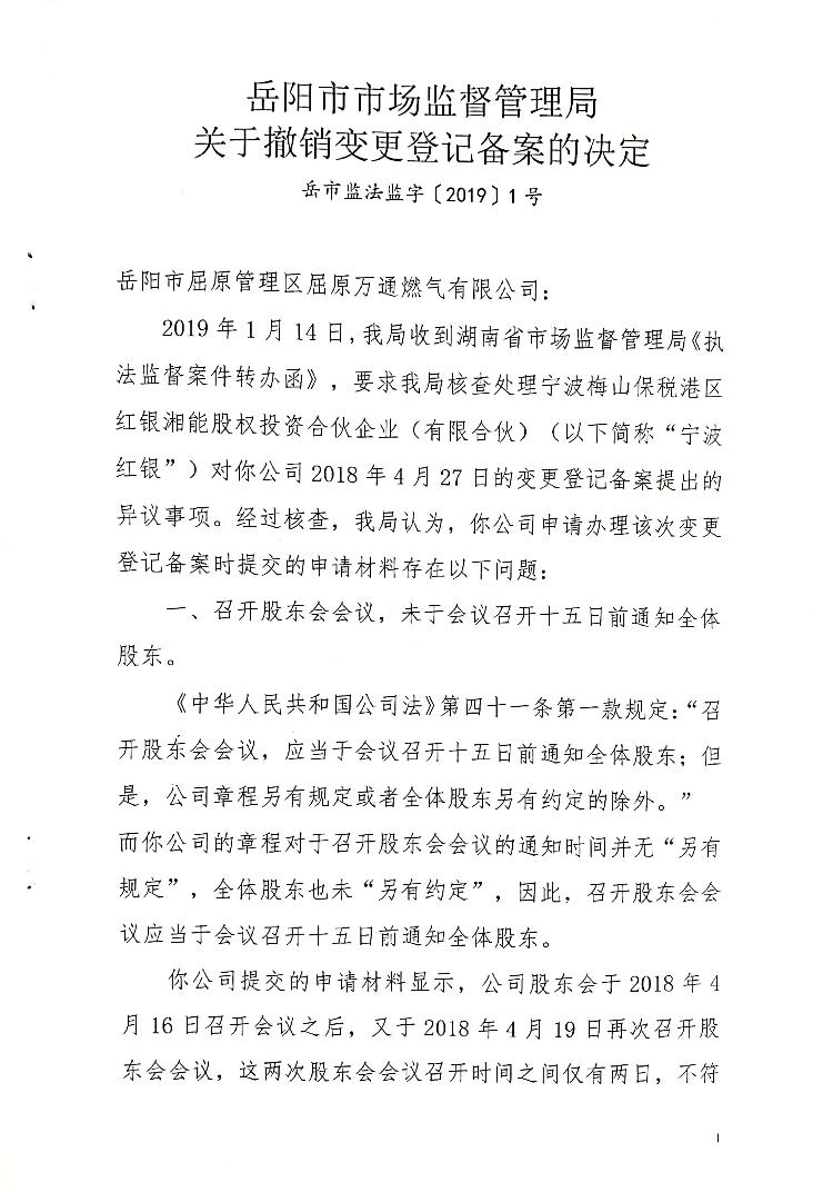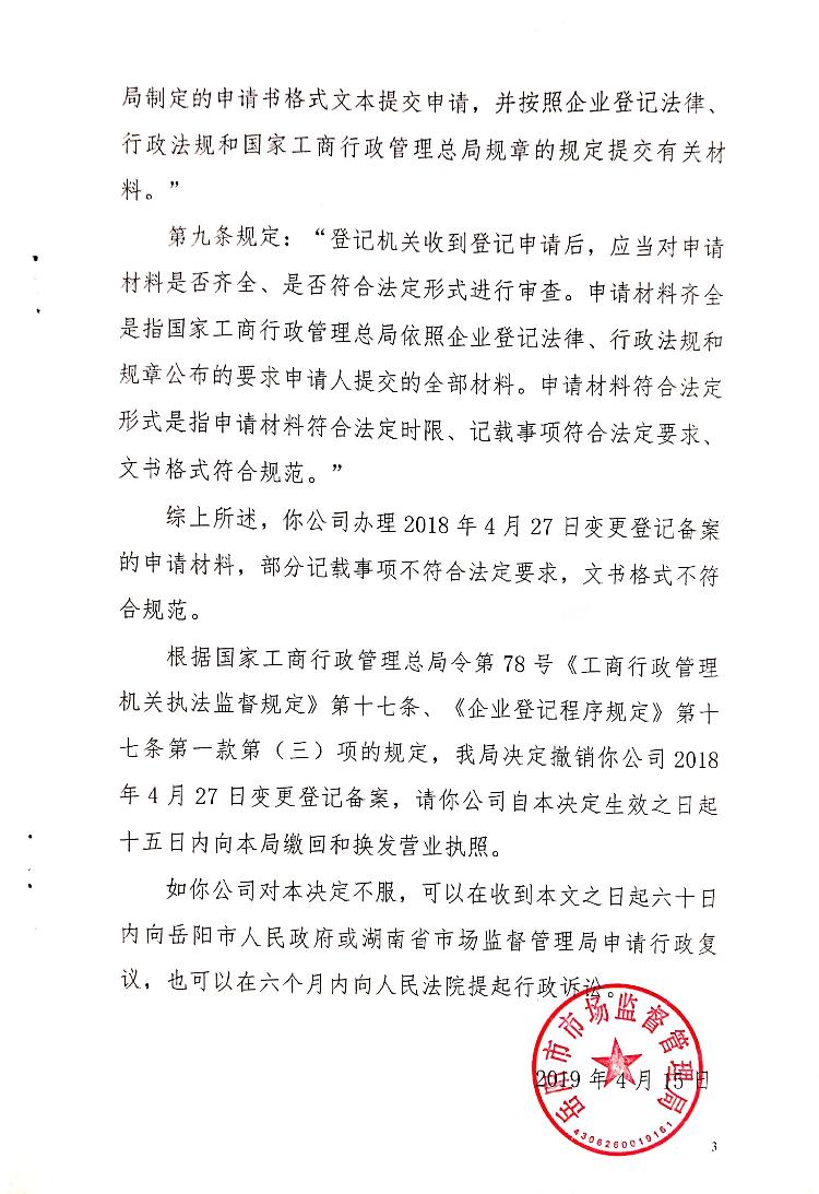 岳阳市市场监督管理局关于撤销变更登记备案的决定