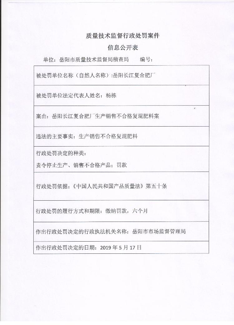 岳阳市市场监督管理局行政处罚决定书(岳阳长江复合肥厂生产销售不合格复混肥料案)