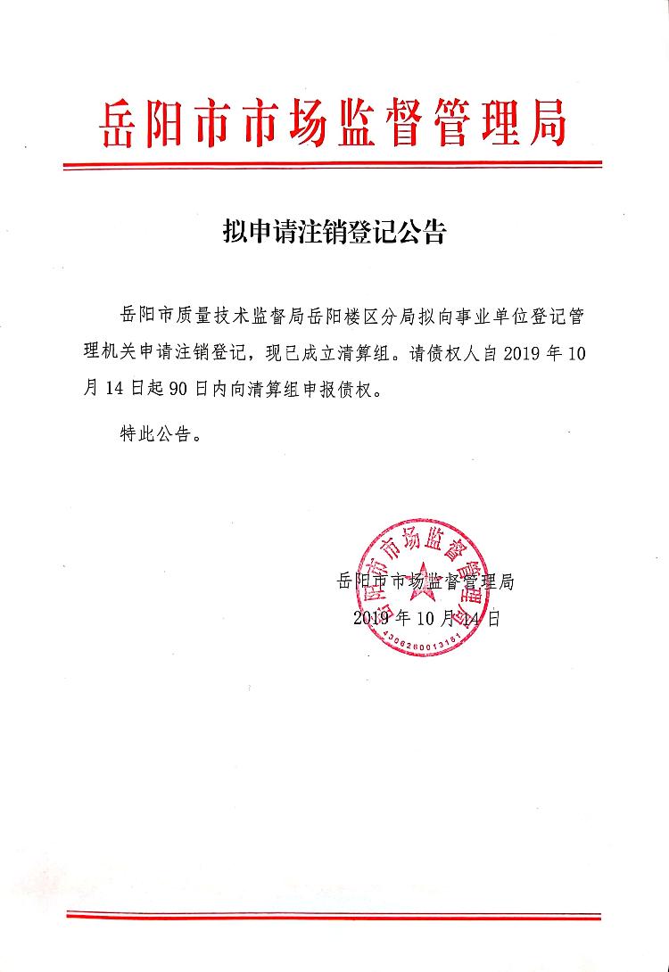 岳阳市质量技术监督管理局岳阳楼区分局拟申请注销登记公告