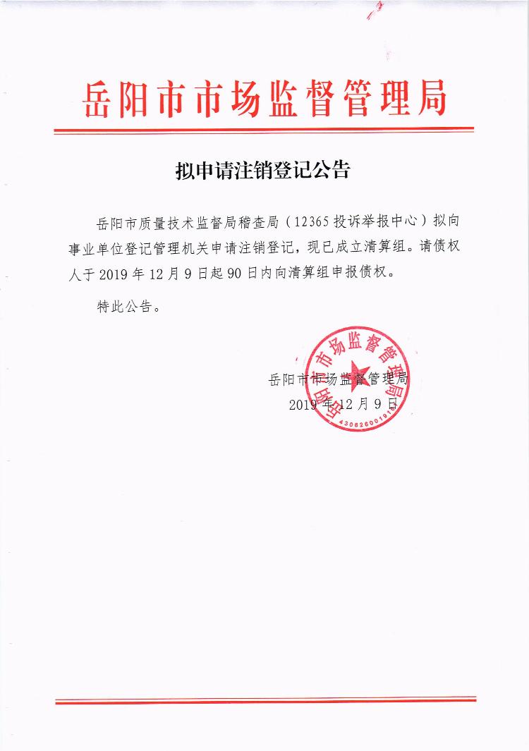 拟申请注销登记公告(岳阳市质量技术监督局稽查局12365投诉举报中心)