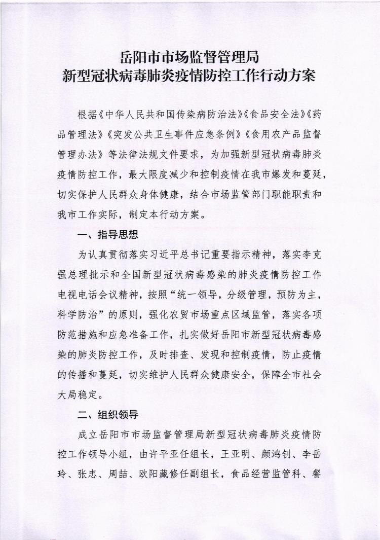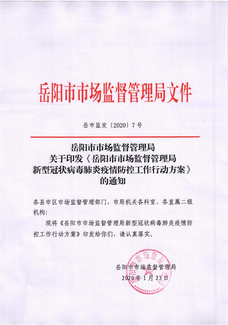 关于印发《岳阳市市场监督管理局新型冠状病毒肺炎疫情防控工作行动方案》的通知
