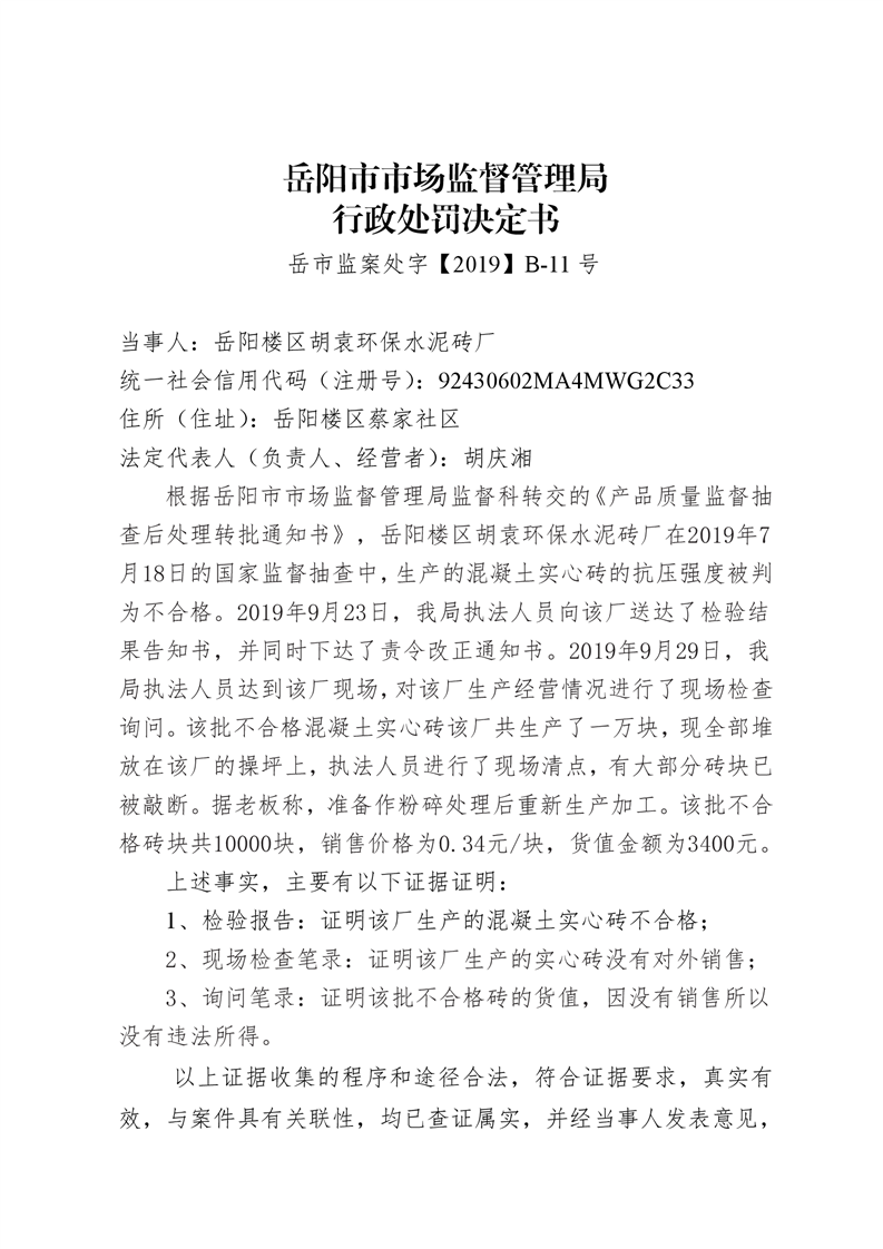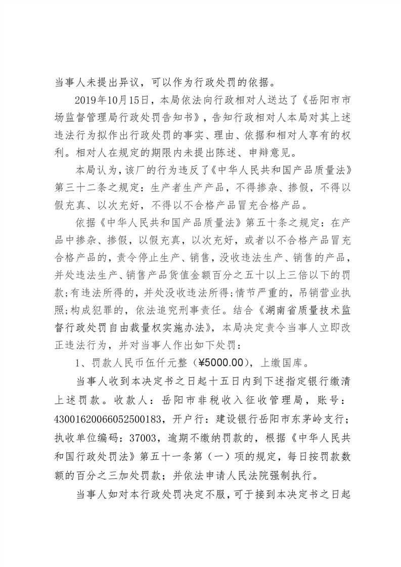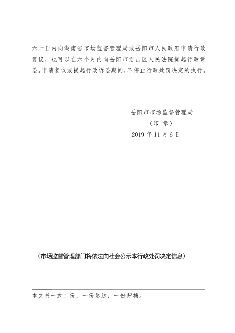 岳阳市市场监督管理局行政处罚决定书(岳市监案处字【2019】B-11号)