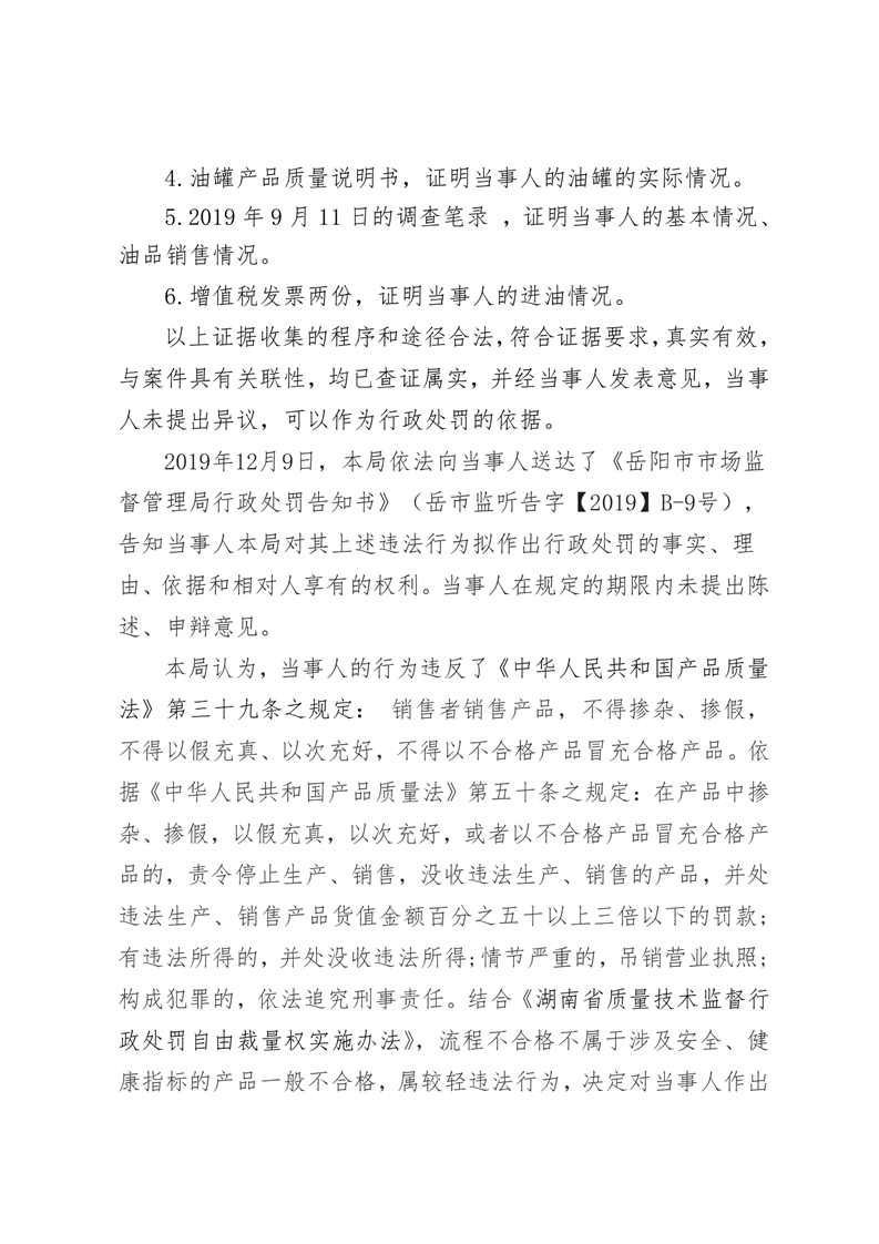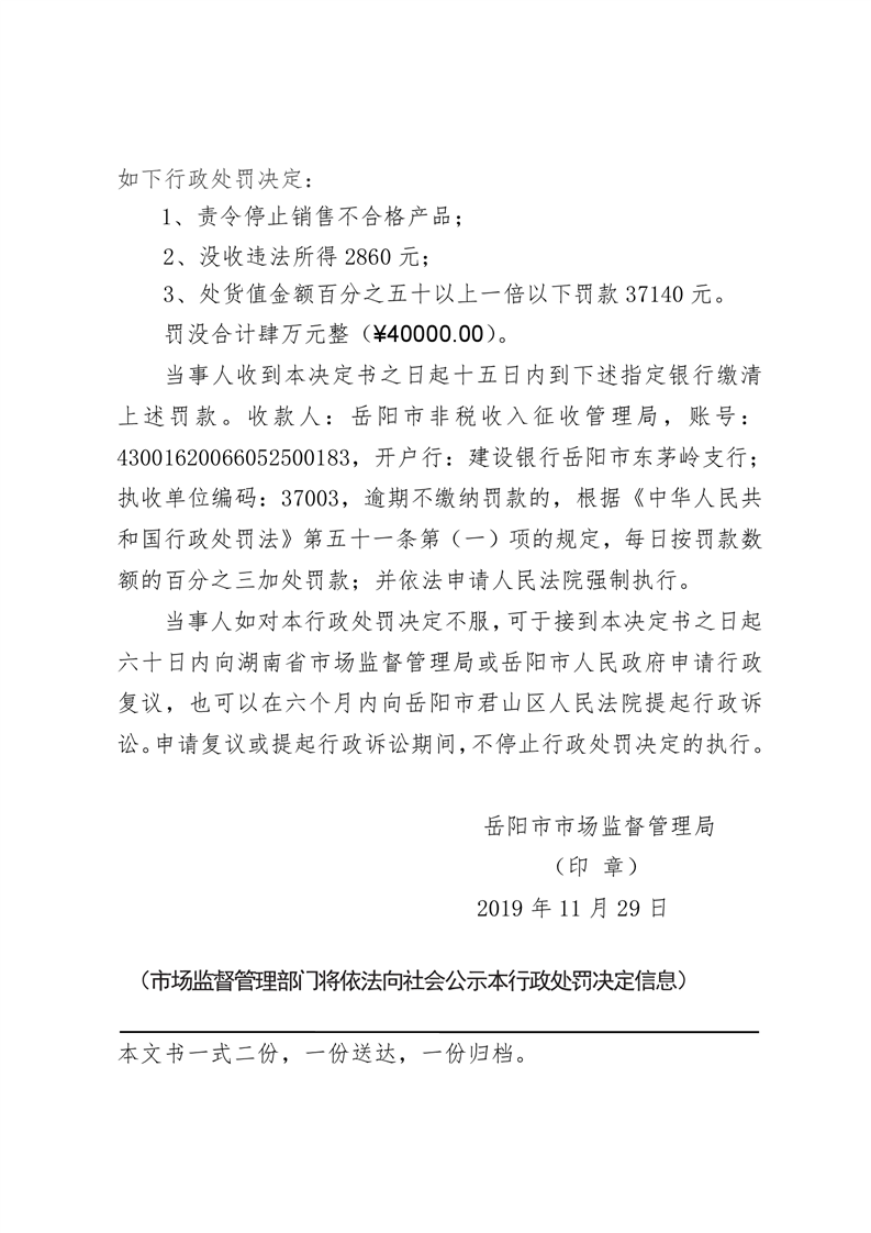 岳阳市市场监督管理局行政处罚决定书(岳市监案处字【2019】B-9号)