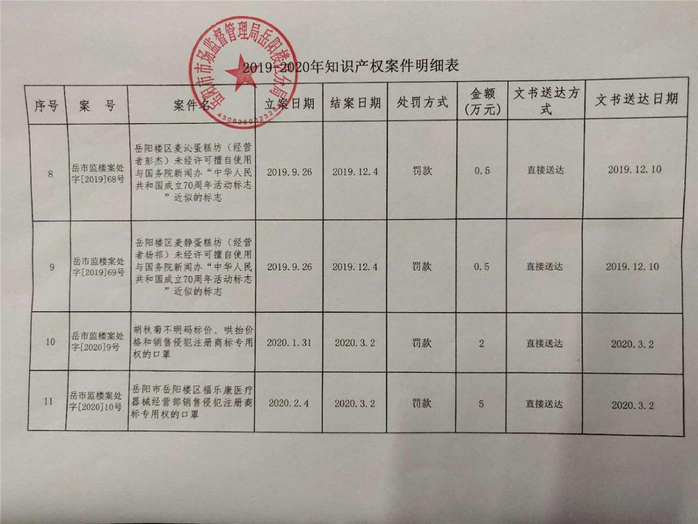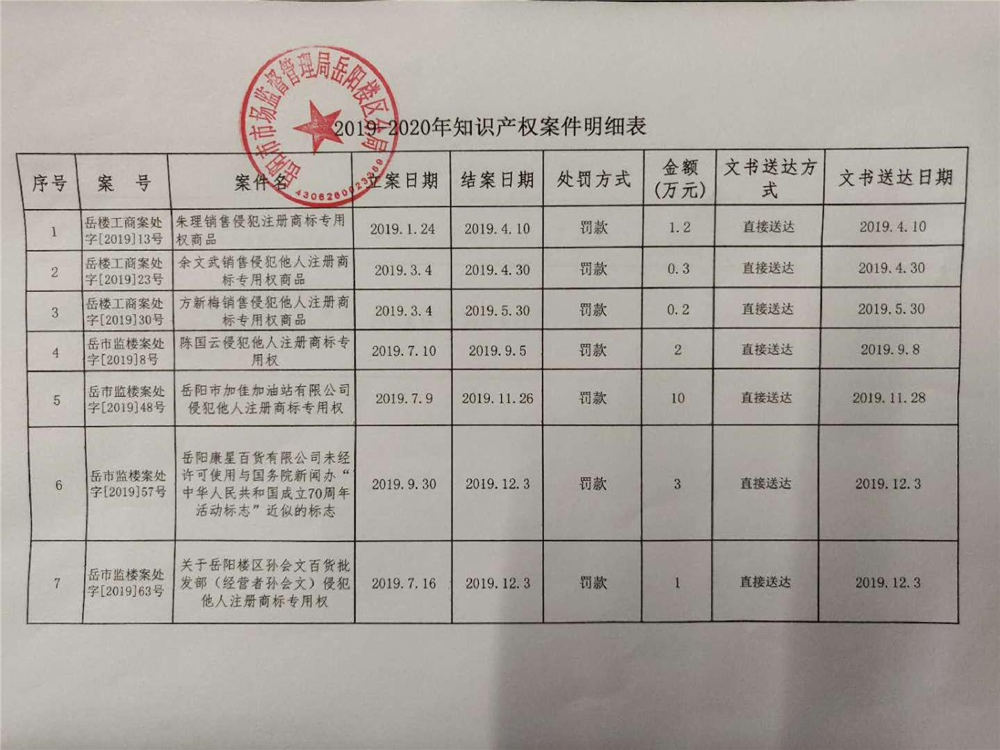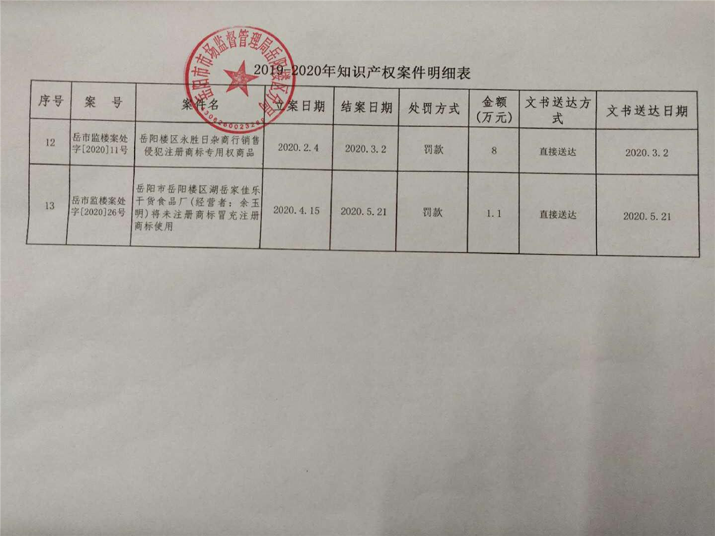 岳阳市市场监督管理局岳阳楼区分局2019-2020年知识产权案件明细表