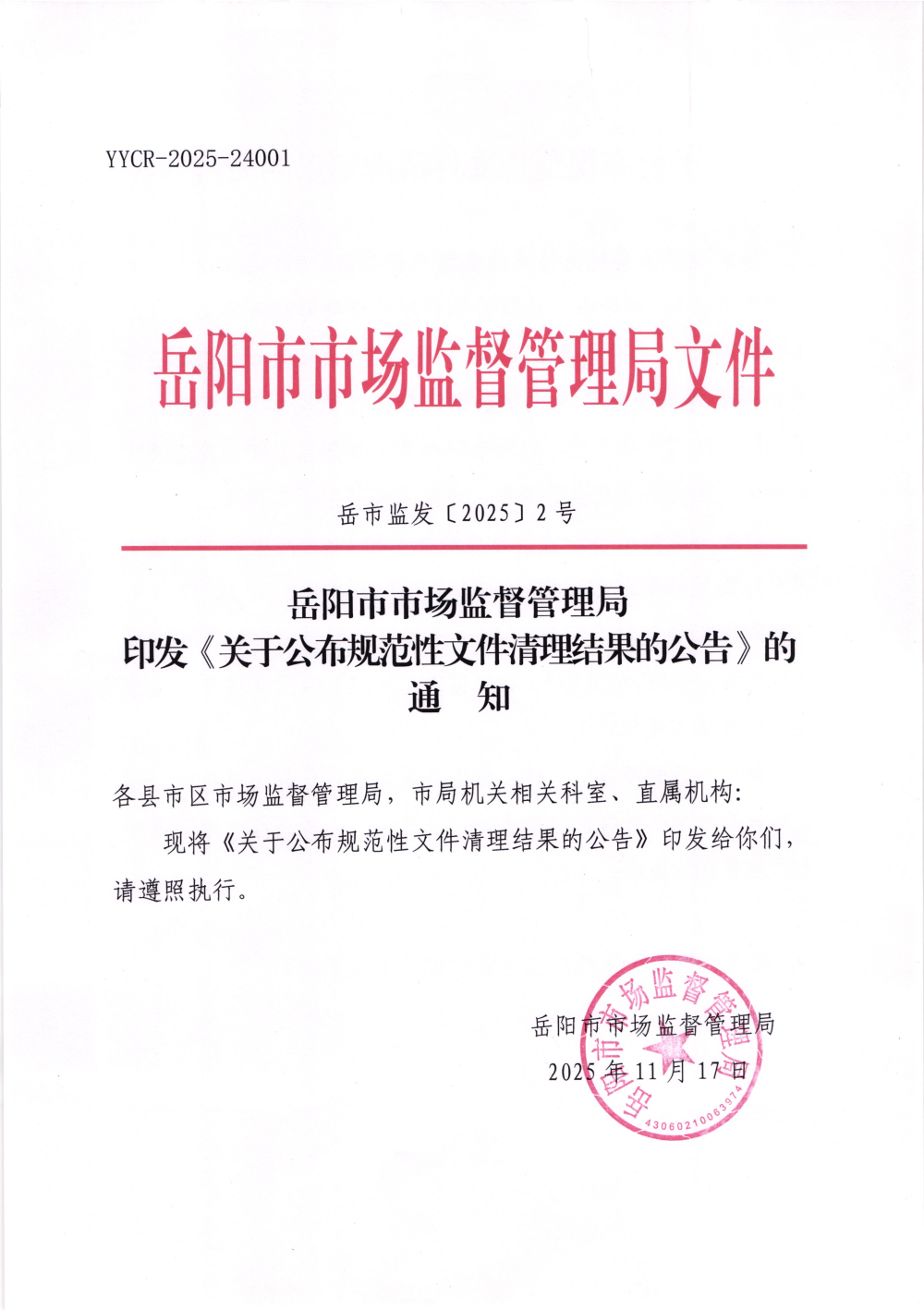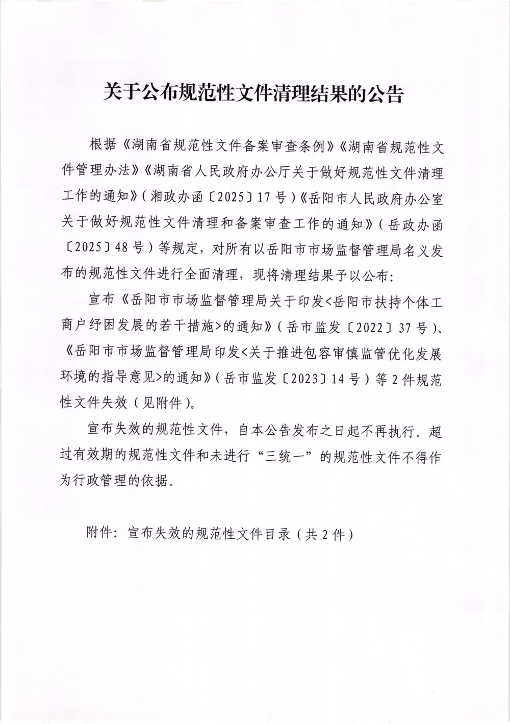 岳阳市市场监督管理局印发《关于公布规范性文件清理结果的公告》的通 知