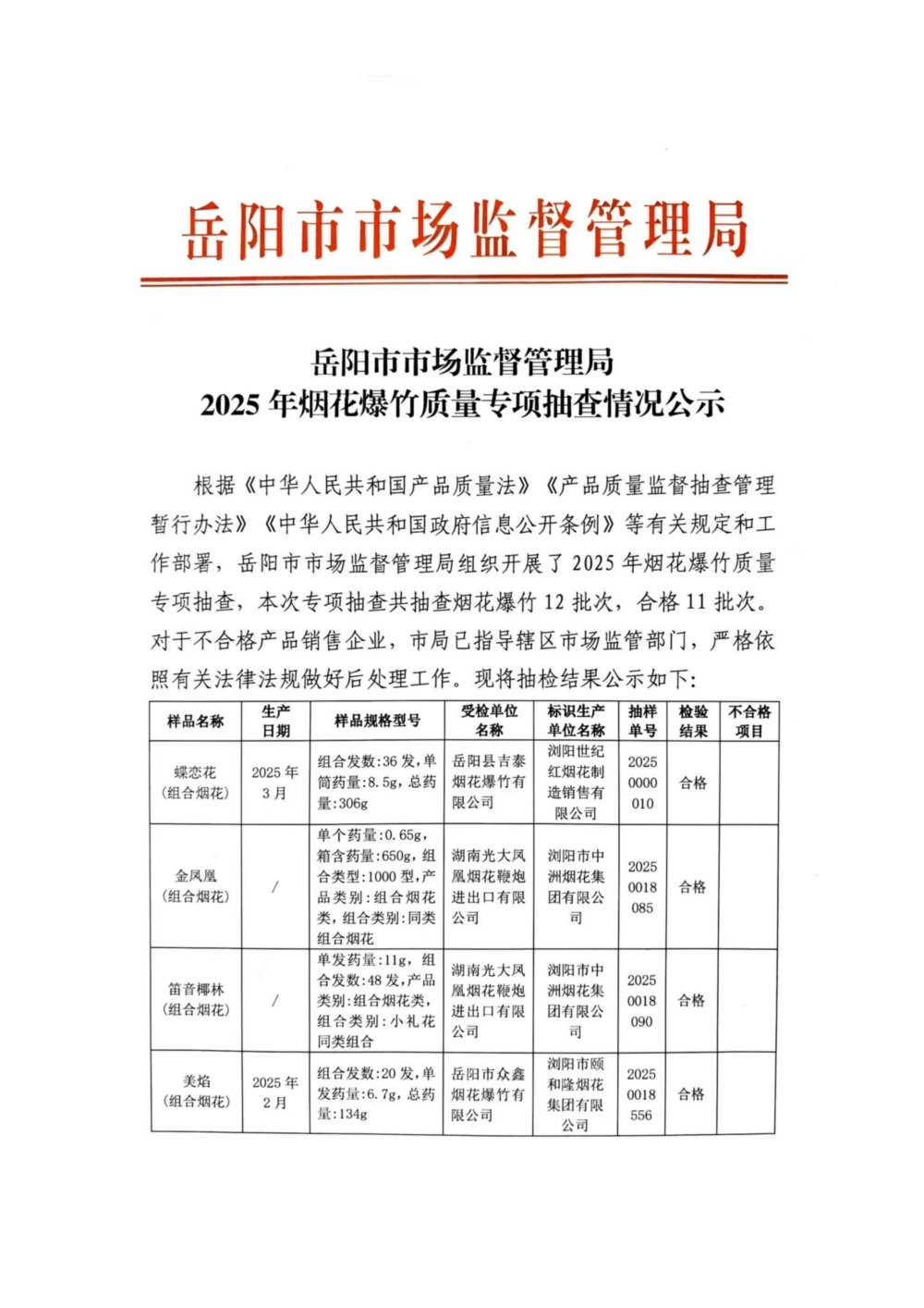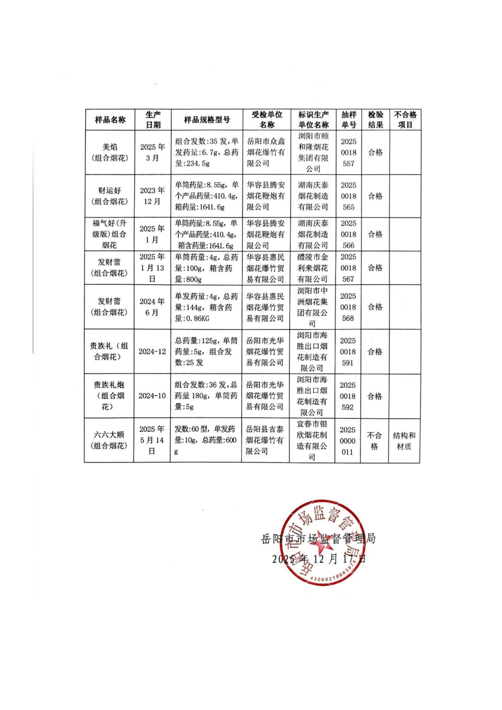 岳阳市市场监督管理局2025年烟花爆竹质量专项抽查情况公示