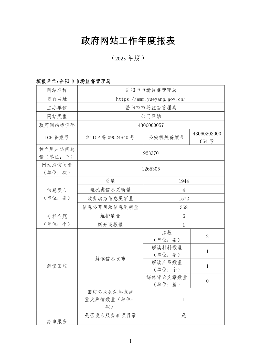 岳阳市市场监督管理局2025年度政府网站工作报表