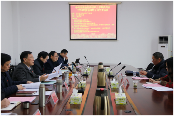 1月14日,湖南食品药品职业学院召开2018年度领导班子民主生活会。会议以“强化创新理论武装,树牢‘四个意识’,坚定‘四个自信’,坚决做到‘两个维护’,勇于担当作为,以求真务实作风坚决把党中央决策部署落到实处”为主题,坚持理论联系实际,坚持问题导向,深入进行党性分析,严肃开展批评和自我批评。省市场监督管理局副巡视员刘迎华,驻省局纪检监察组副组长刘杏花到会指导。学校党委班子成员出席会议,党政办、纪检监察室等部门负责人列席。会议由党委书记杨文伟主持。