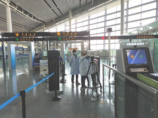 1月31日,红外体温计现场计量检测/校准小分队7名成员再次来到长沙黄花国际机场,对新添置的疫情防控用红外体温计、红外筛检仪进行现场校准,考虑到机场人口流动量大,疫情监测仪器校准时可能会带来漏测现象,一方面安排在航班间歇实施计量校准,另一方面提前携带了10台已校准好的红外测温仪,用于备用监测,在计量检测过程中保证了进出港人员全覆盖。
