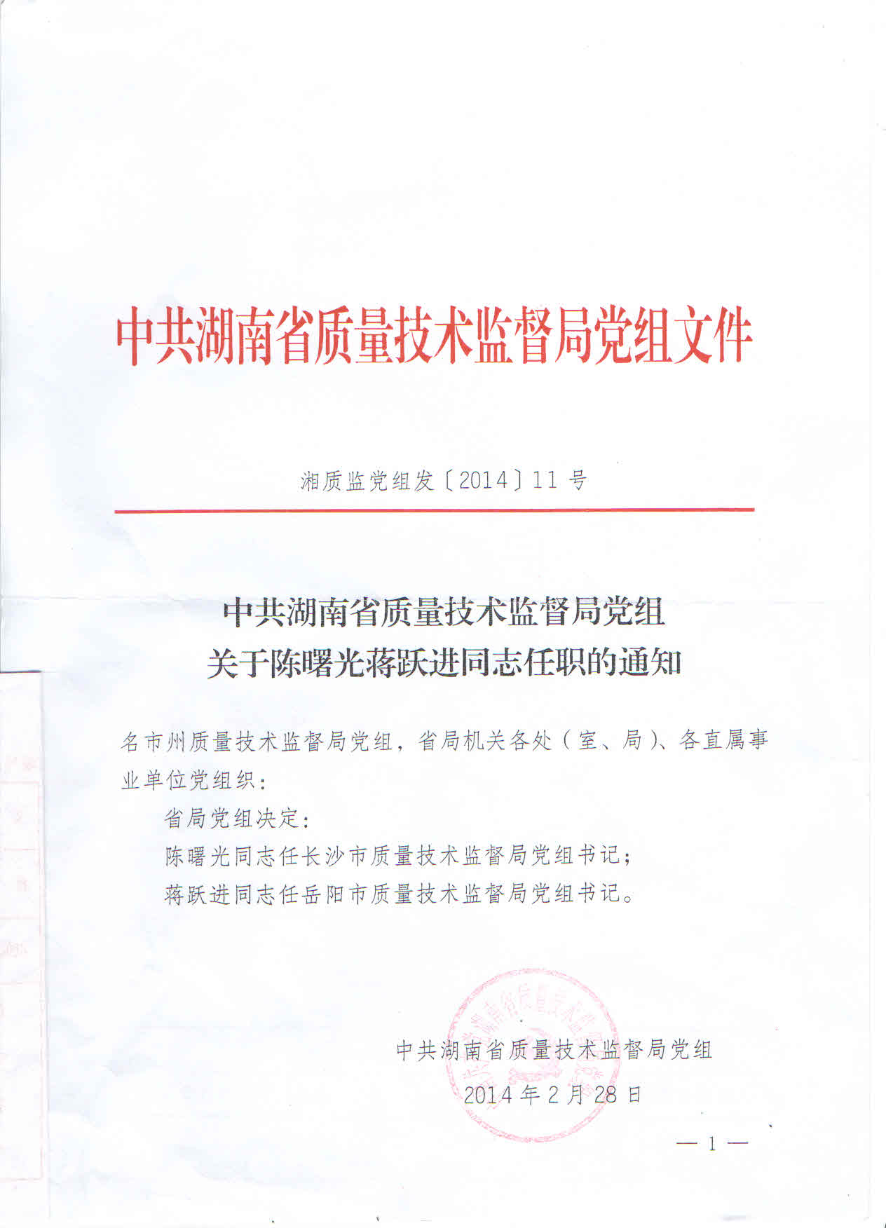中共湖南省质量技术监督局党组关于陈曙光蒋跃进同志任职的通知