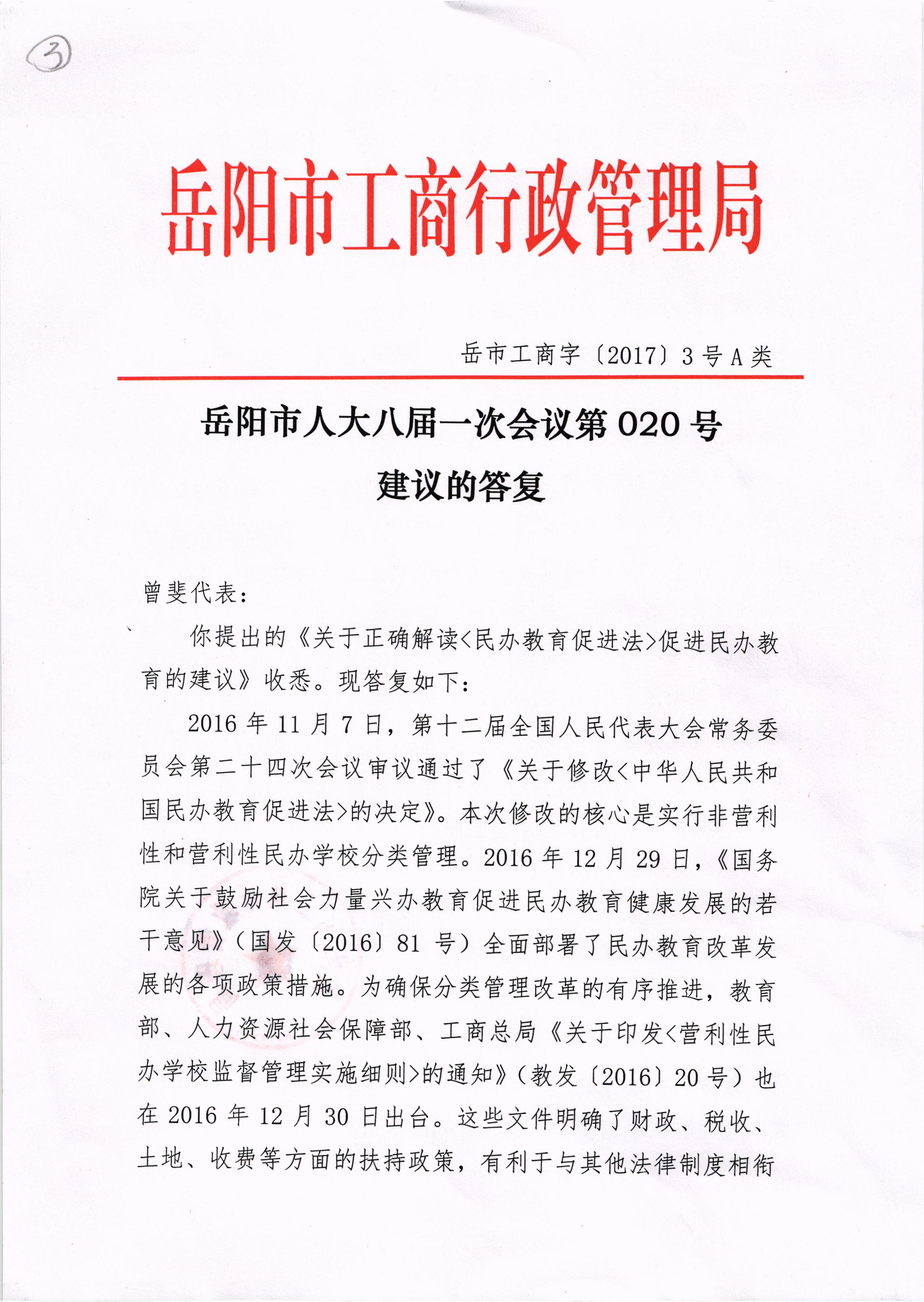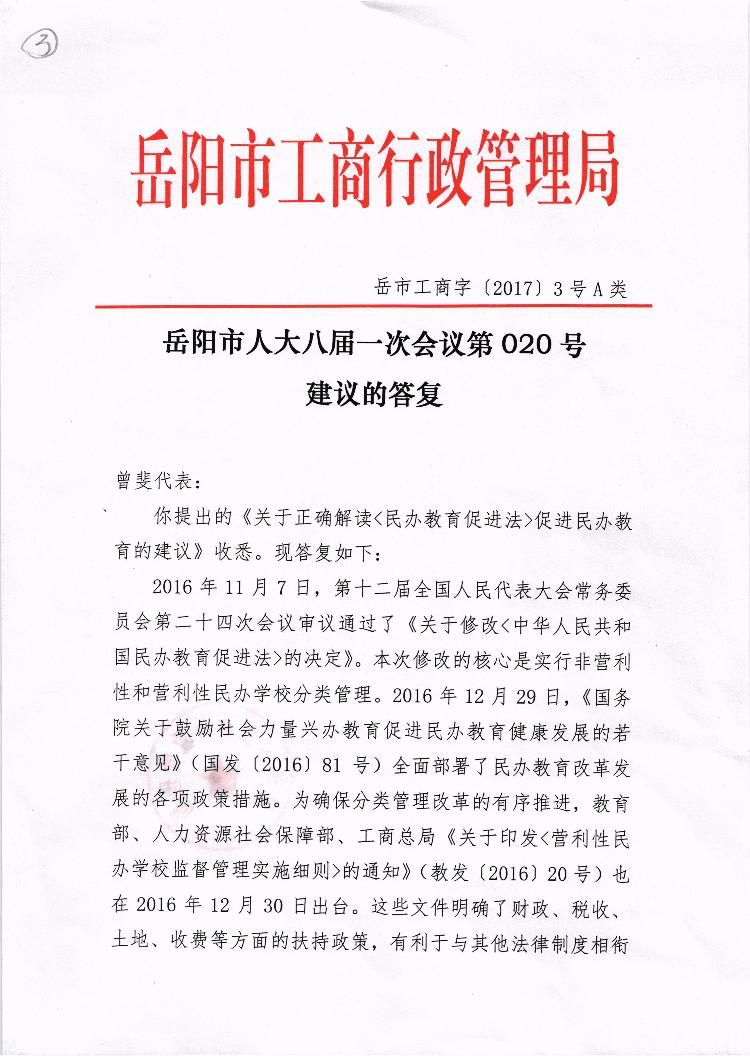 对岳阳市人大八届一次会议第020号建议的答复
